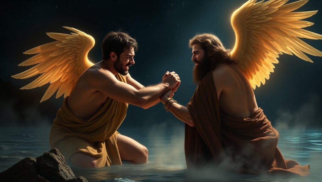Na noite antes do encontro com Esaú, Jacó teve uma experiência sobrenatural extraordinária – ele lutou com um homem (identificado como anjo ou o próprio Deus) até o amanhecer. Esta luta física simbolizava sua luta espiritual interna.